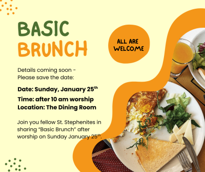 The Vestry welcomes you to a Basic Brunch after the 10 AM service on Sunday, January 25. Share good food and even better fellowship in the Dining Room!